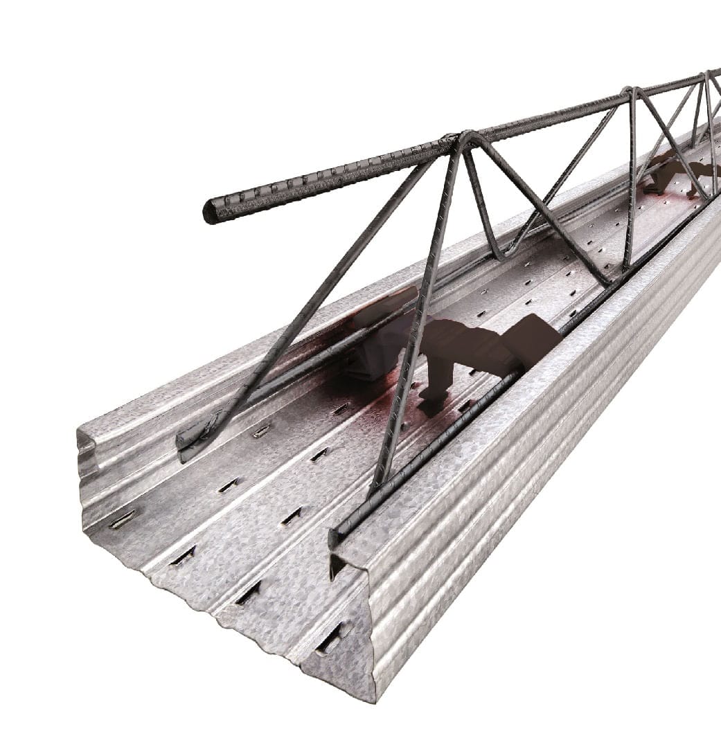 A fôrma da Trelifácil é confeccionada com aço zincado, que proporciona maior resistência à oxidação e corrosão, aumentando a durabilidade do sistema. O lado interno da fôrma possui espaçadores plásticos, fixados a cada 33cm, que garantem o perfeito encaixe e o posicionamento uniforme da armadura treliçada no conjunto da vigota, oferecendo precisão e segurança na montagem.